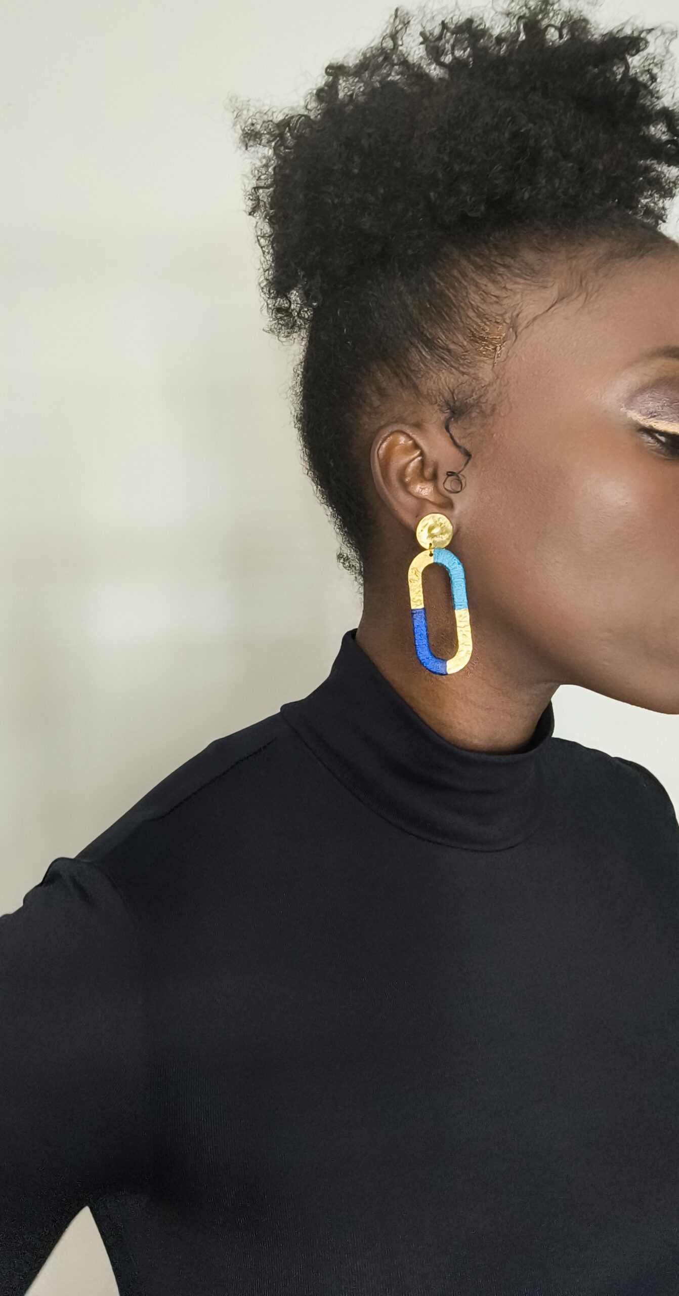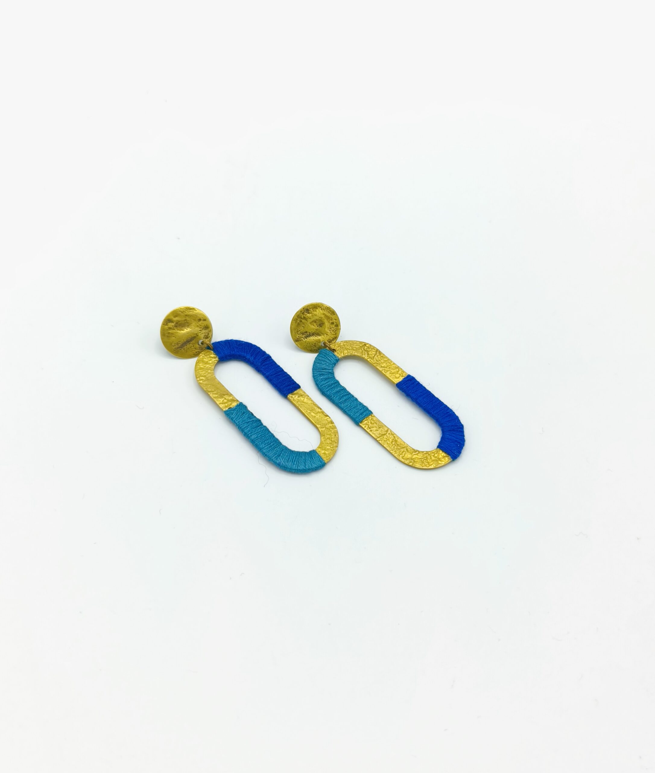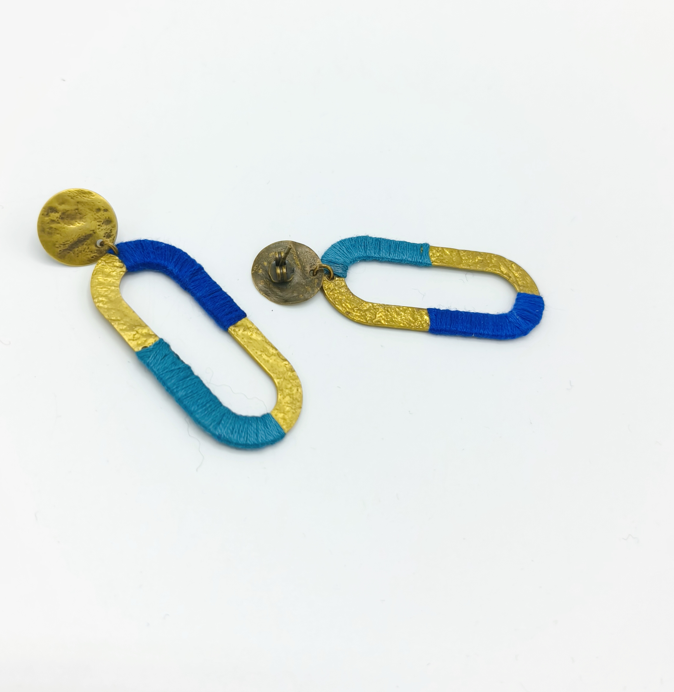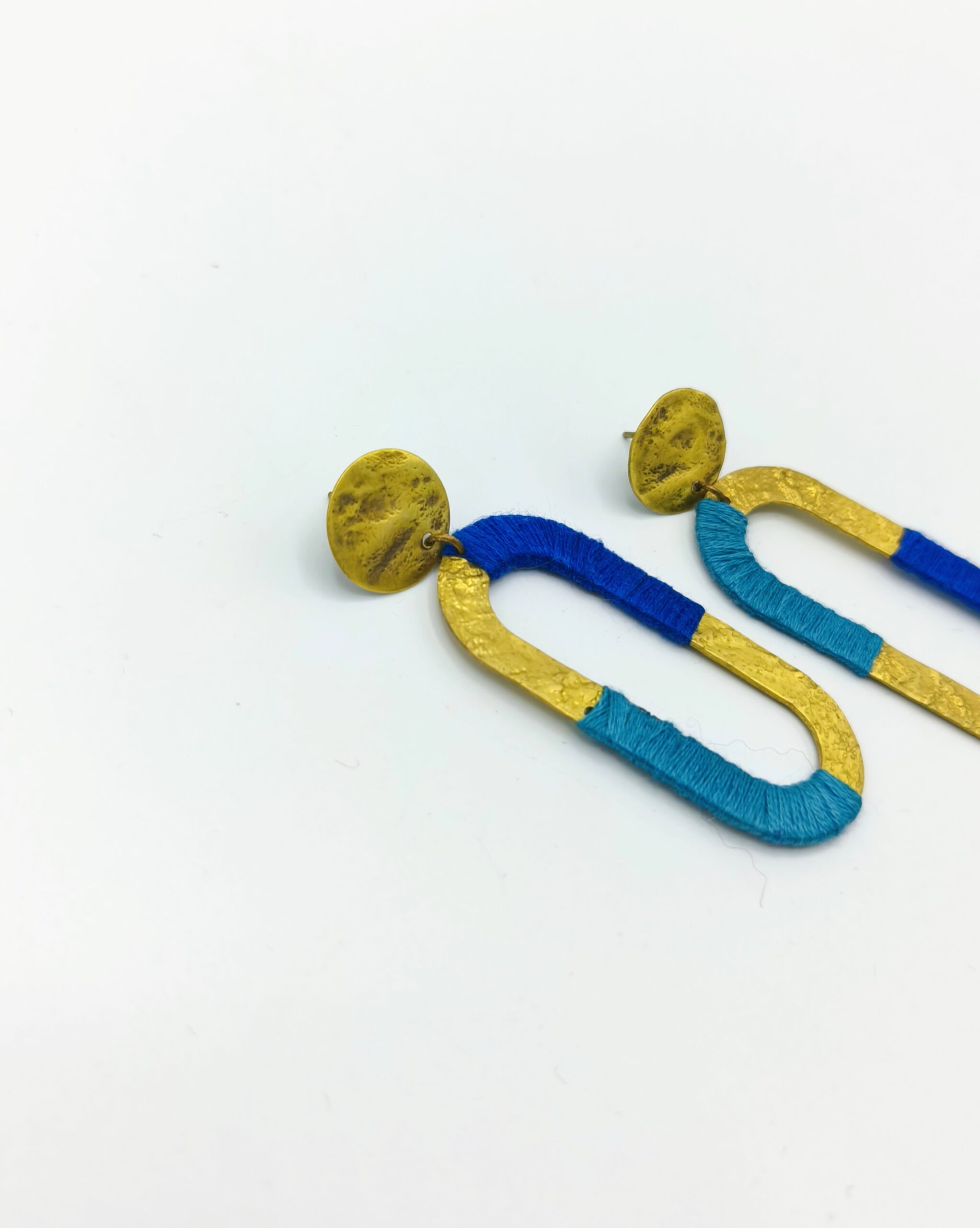 Boucles d’oreilles graphiques en laiton martelé recouvert d’un duo de fil à broder bleu.