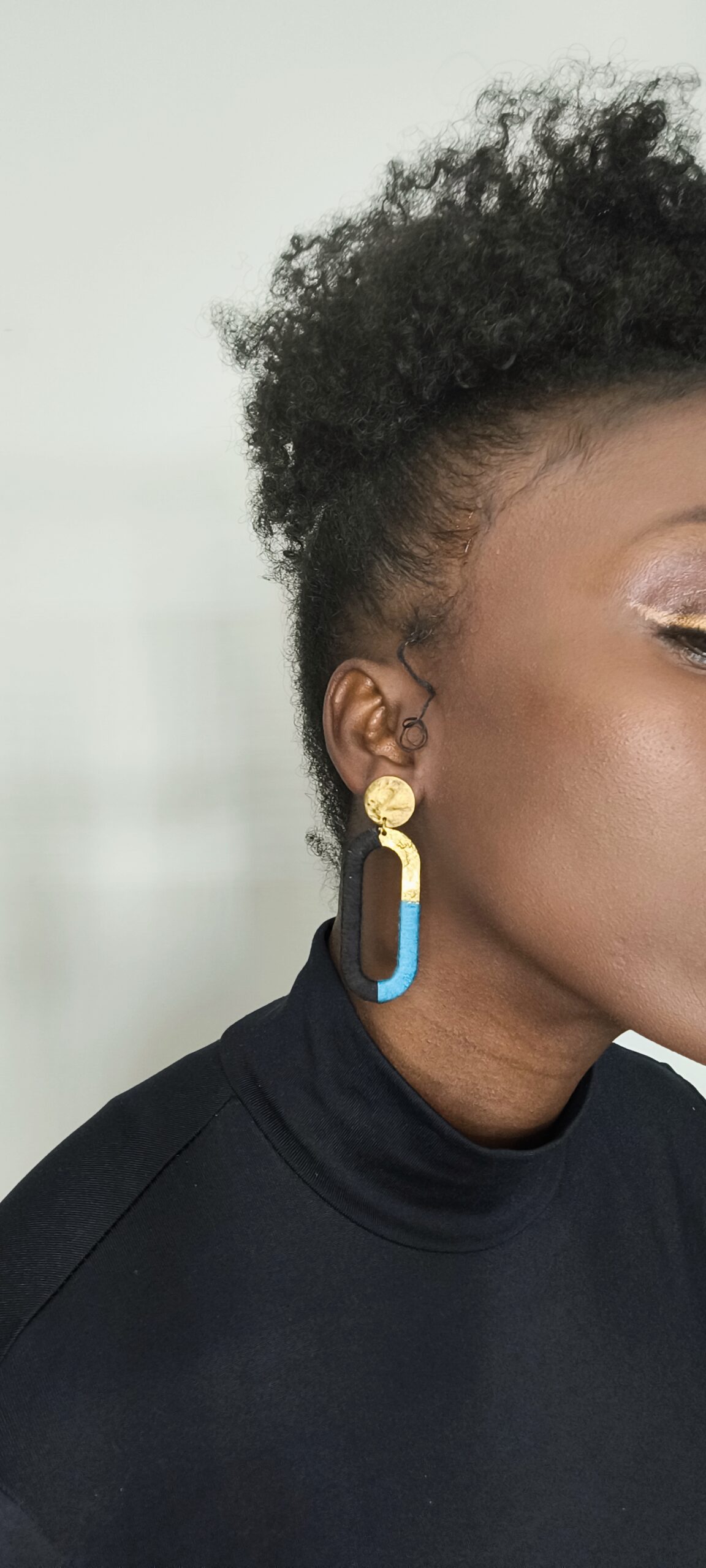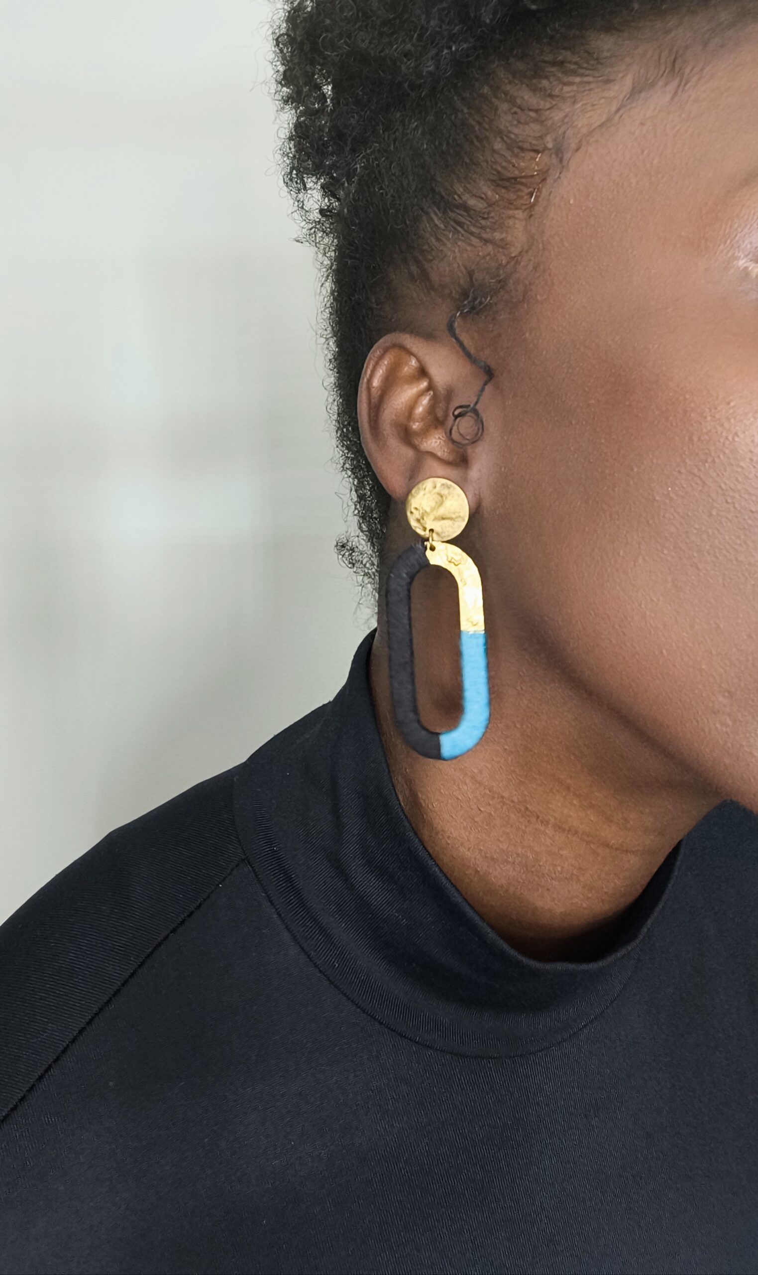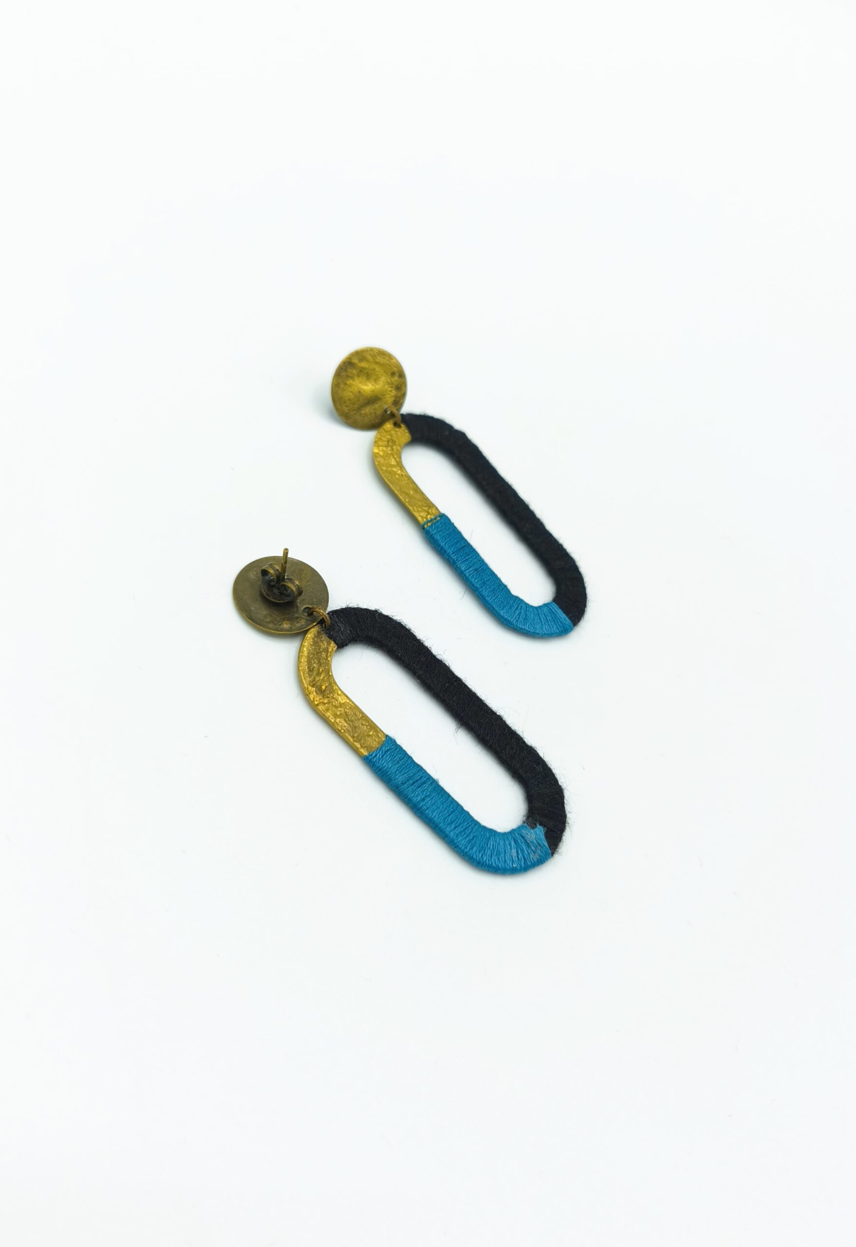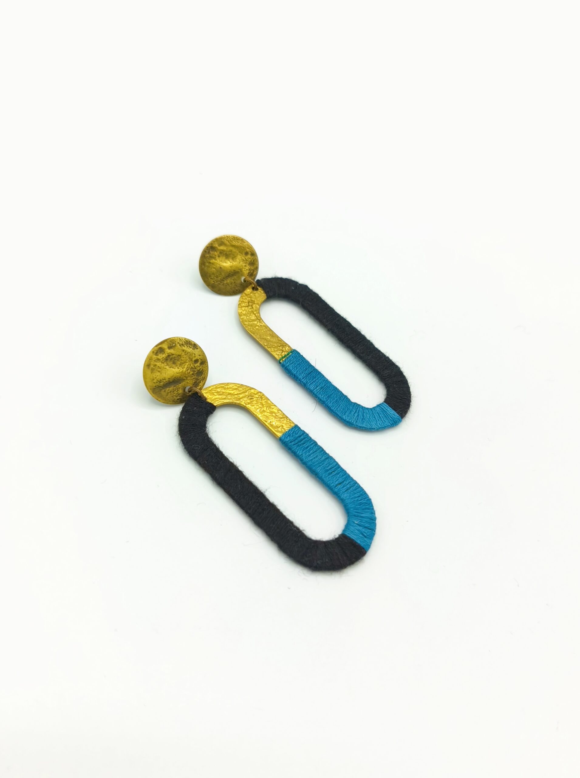 Boucles d’oreilles graphiques en laiton martelé recouvert d’un duo de fil à broder .