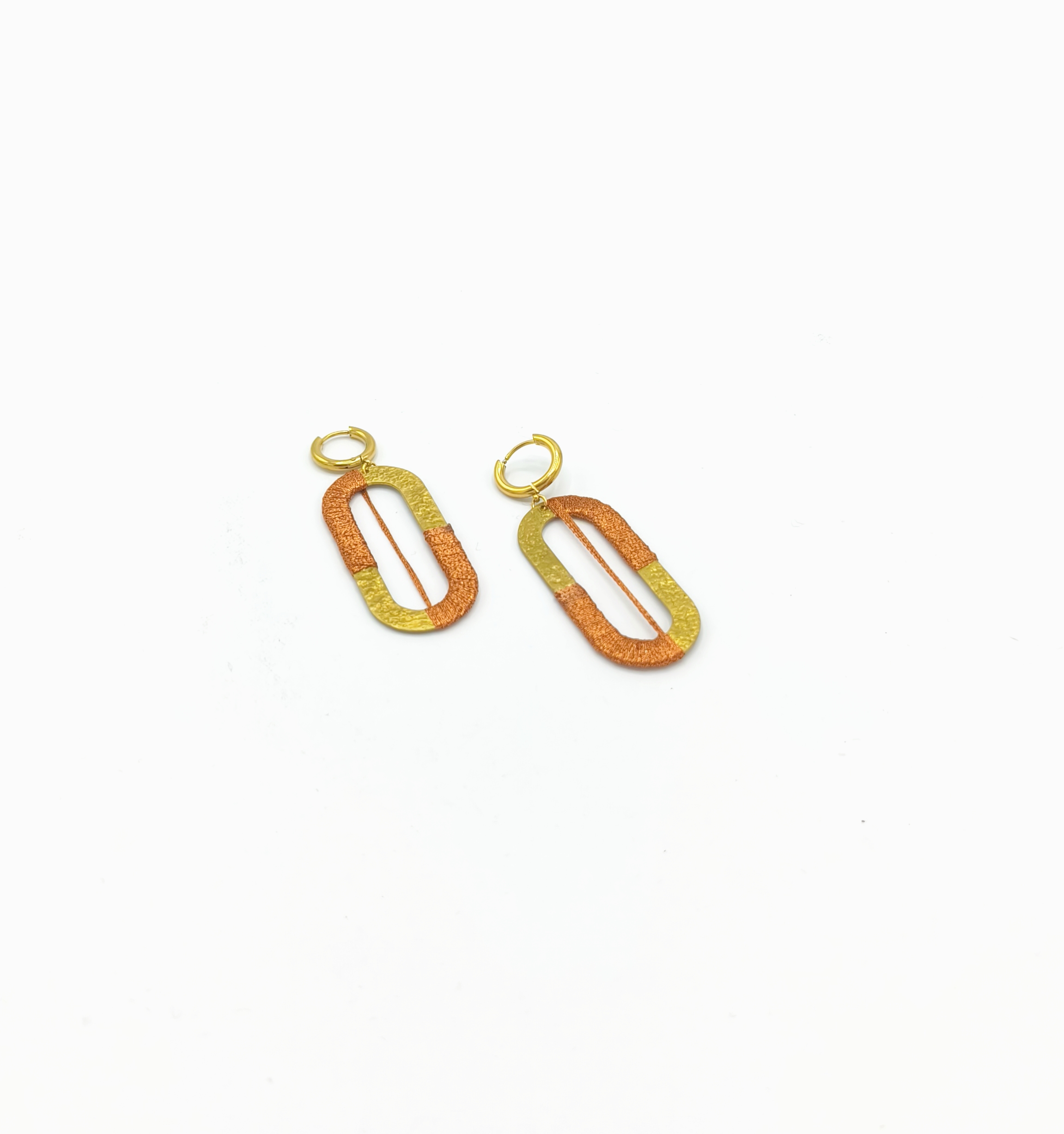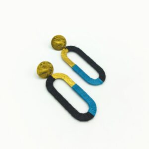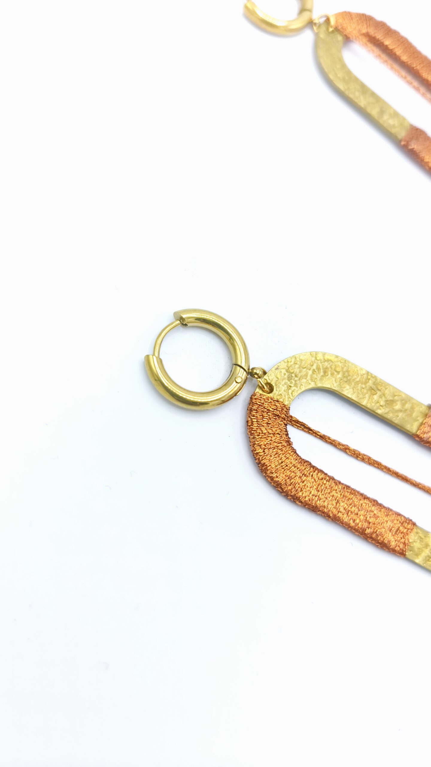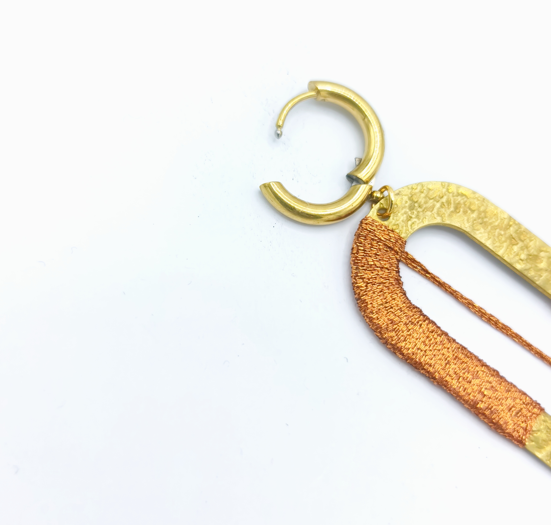 Boucles d’oreilles graphiques en laiton martelé recouvert d’un duo de fil à broder .