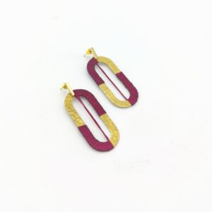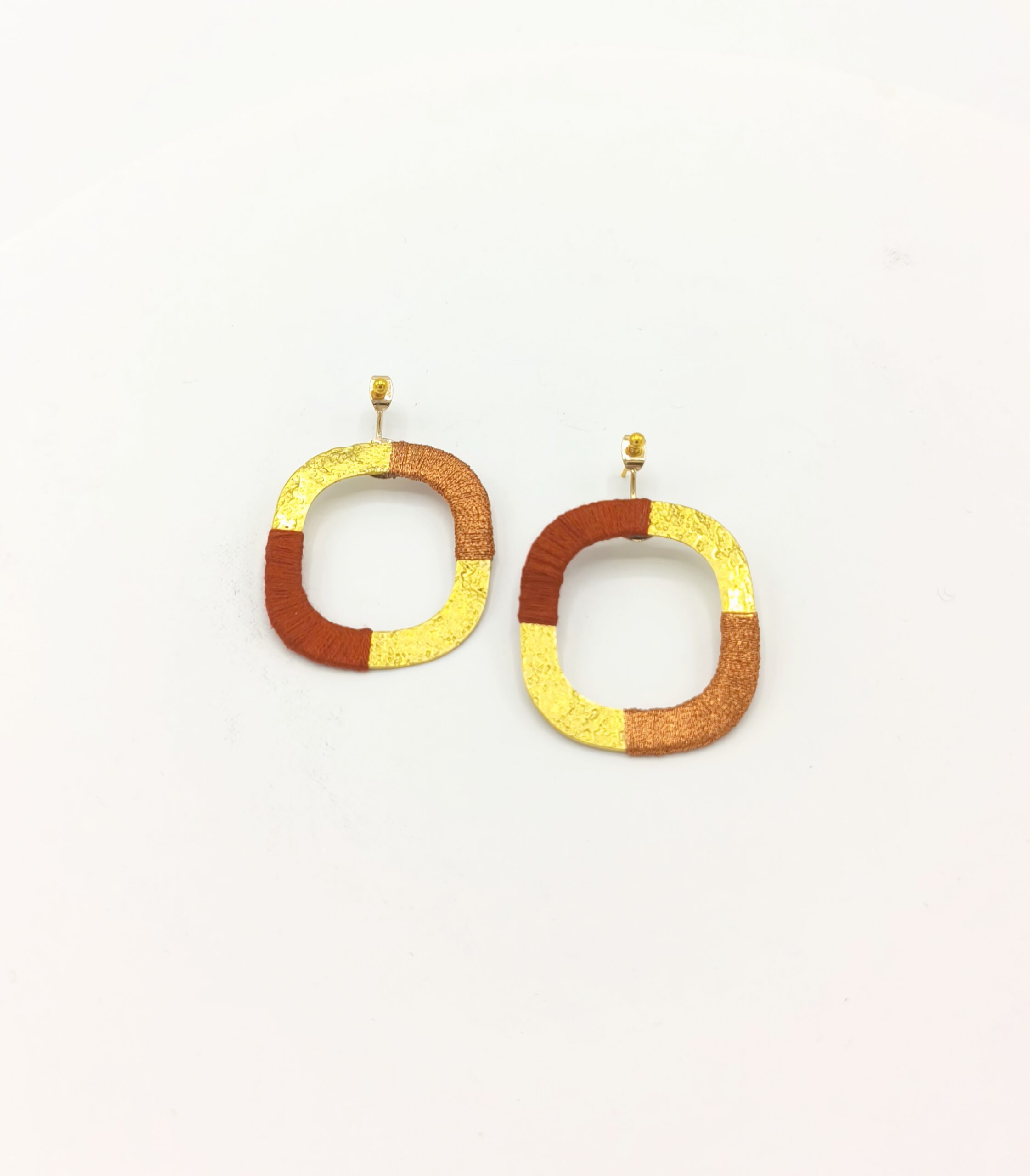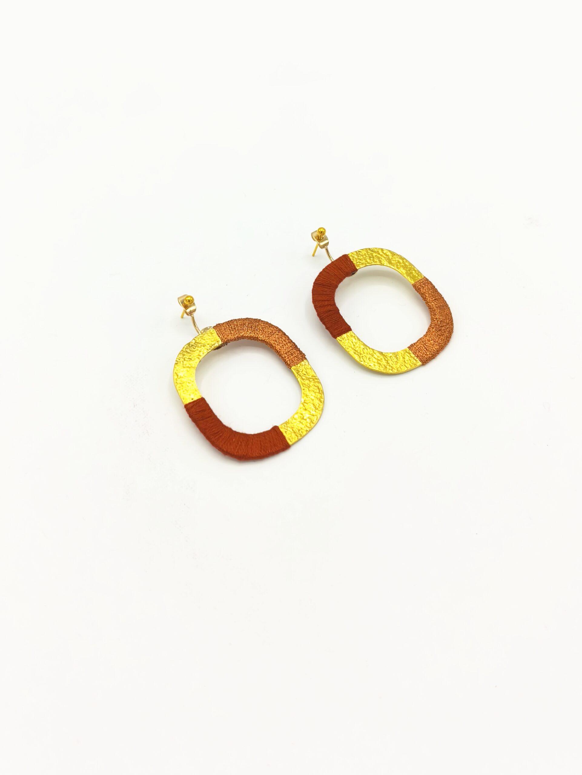Boucles d’oreilles graphiques en laiton martelé recouvert d’un duo de fil à broder .