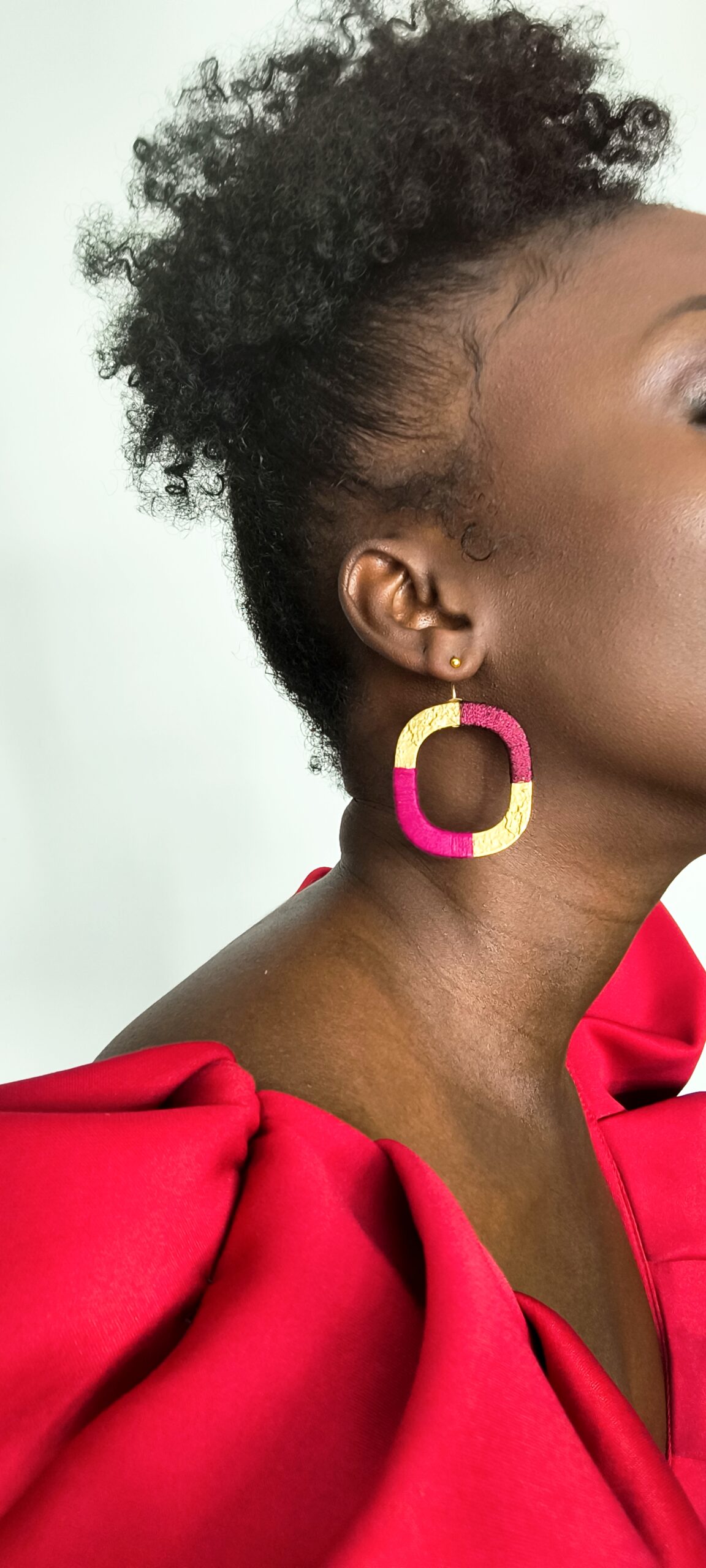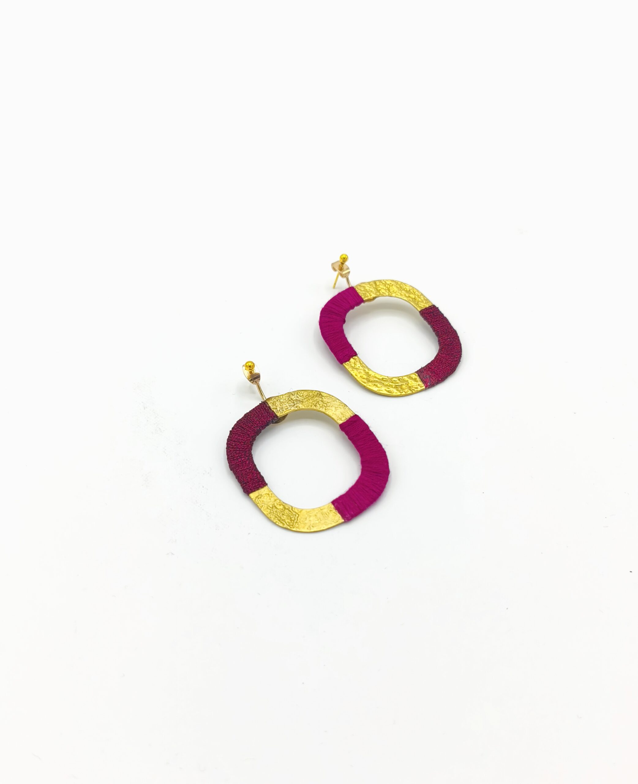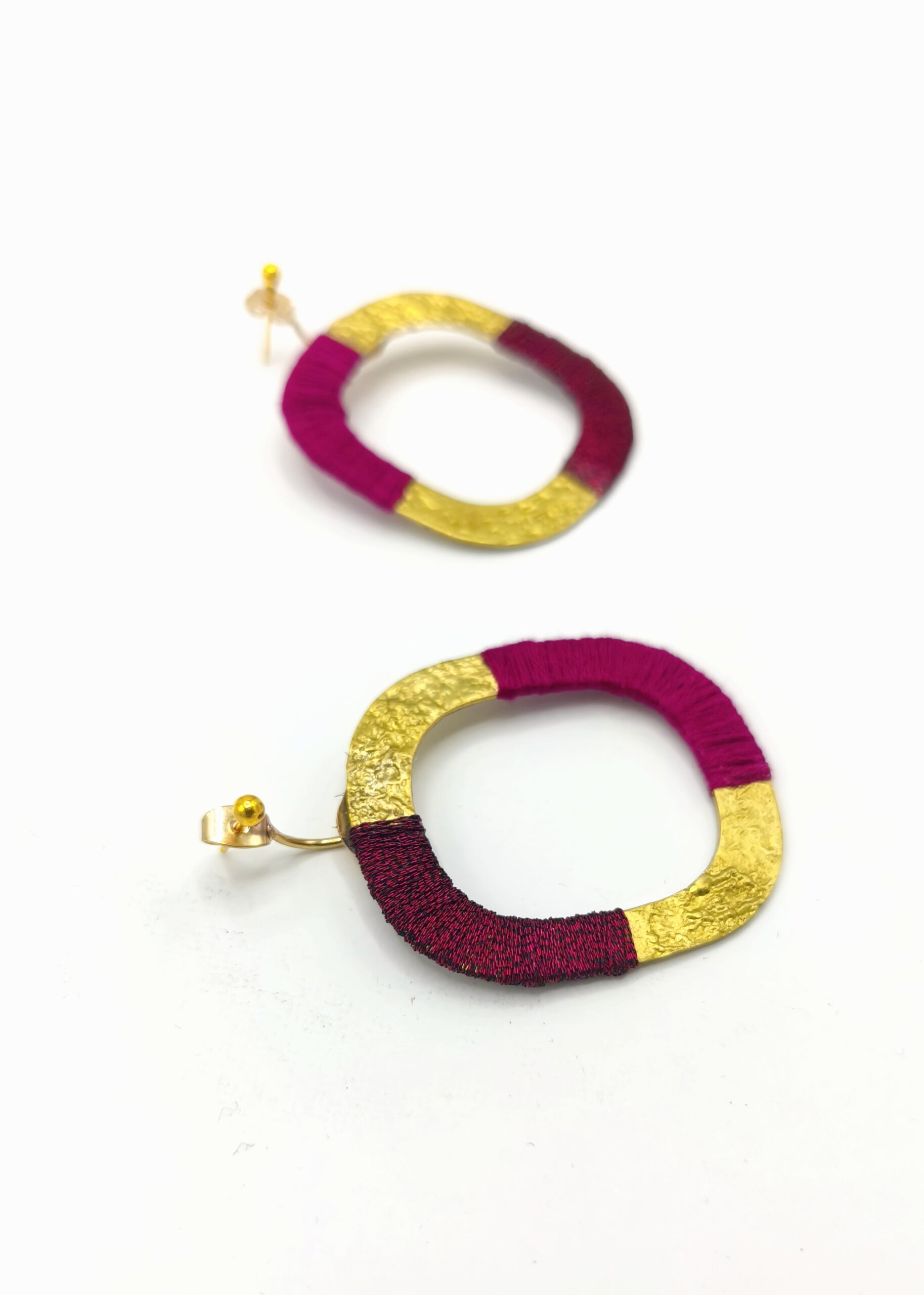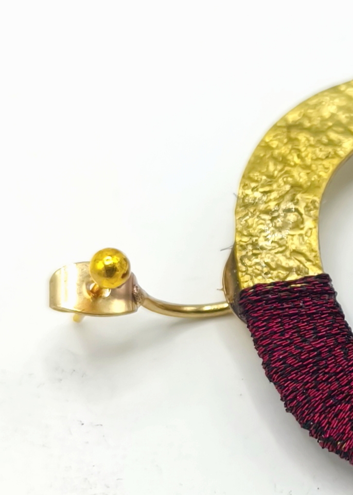 Boucles d’oreilles graphiques en laiton martelé recouvert d’un duo de fil à broder .