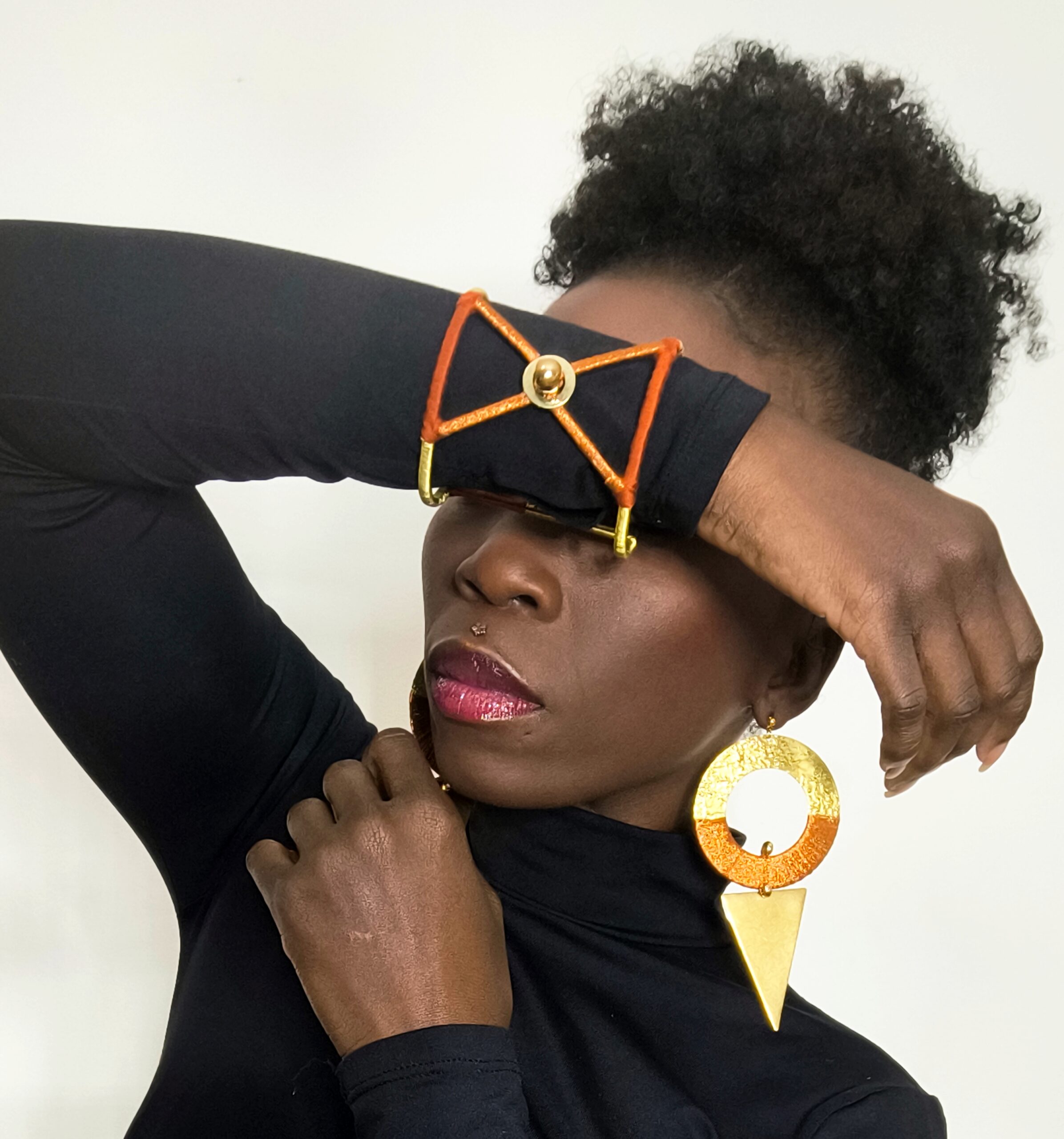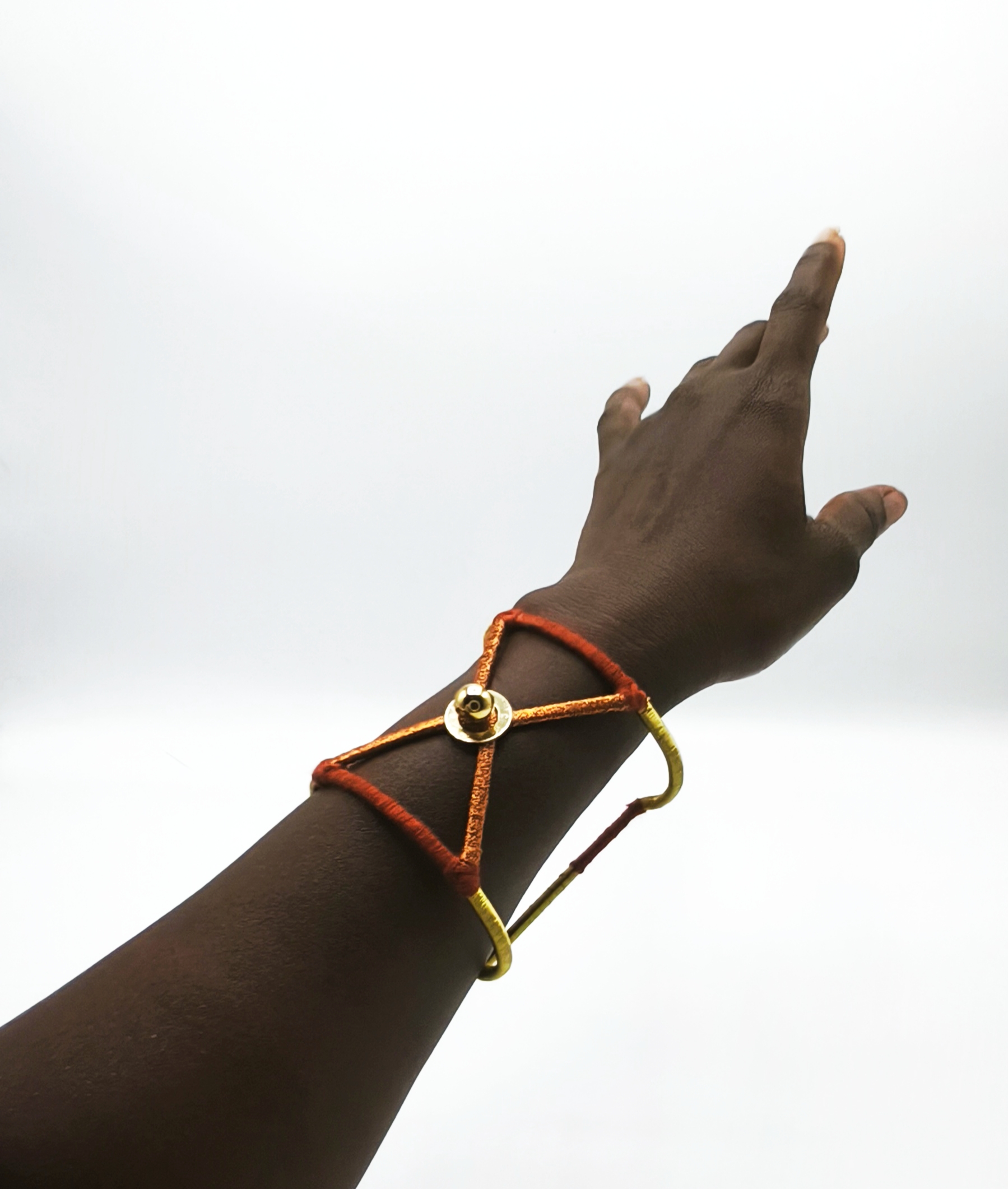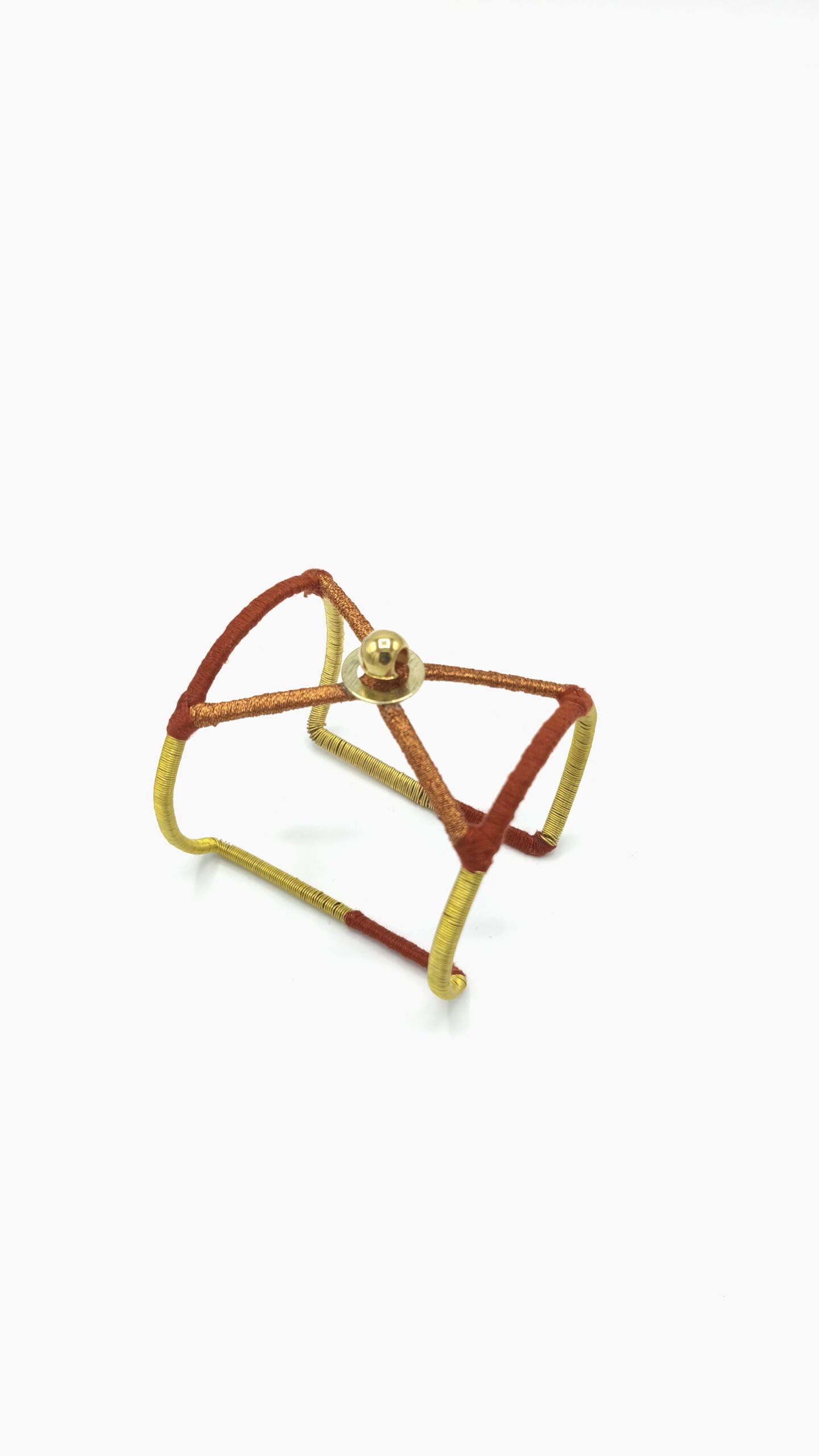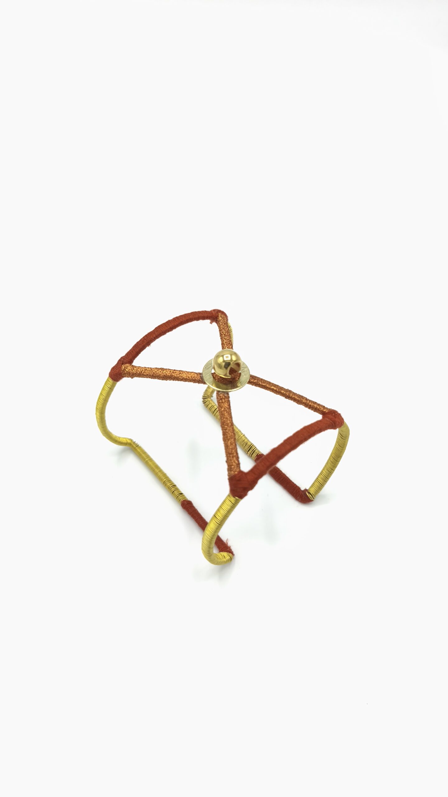 Facile à porter et ajustable, il est fabriqué sur une base en laiton recouverte de fil en laiton doré et de fil à broder couleur camel.